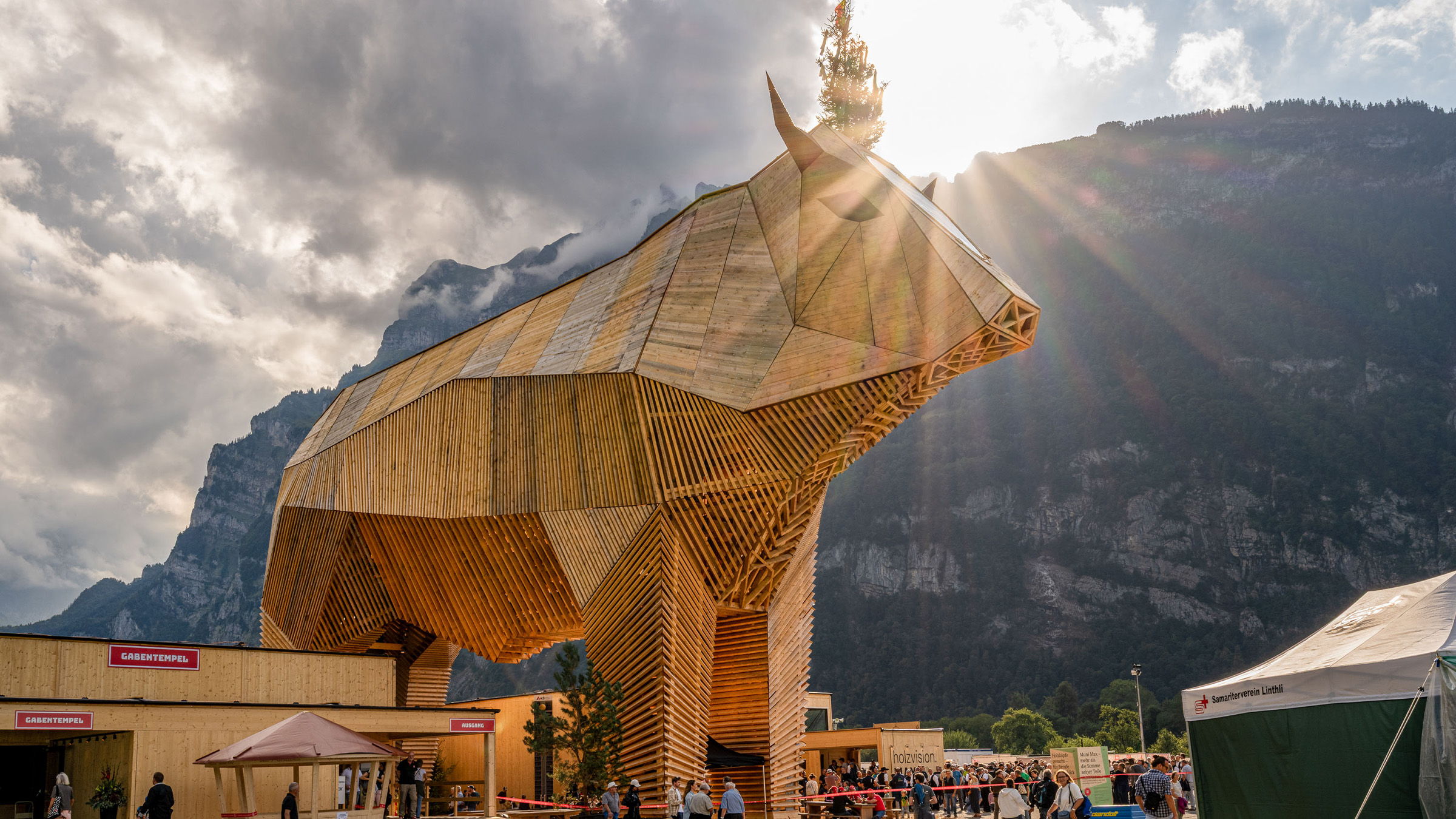 Was Muni Max besonders macht, ist nicht nur seine Dimension, sondern die Art seiner Entstehung: Über 500 Lernende wirken aktiv am Projekt mit – von der Planung über die Fertigung bis zum Aufbau. Aus Nebenprodukten der Holzproduktion entstanden in Schreinereien die Innenausbauten für Gabentempel und Schwingerbar. Auch der Lebendpreisstall wurde vollständig mit vorhandenem Holz realisiert. Die gestalterischen Konzepte stammen von Auszubildenden der ibW Höheren Fachschule Südostschweiz. So wird Muni Max zum Zentrum eines lebendigen «Muni Dorfs», das jungen Talenten Perspektiven eröffnet und eindrucksvoll zeigt, wie aus regionalem Holz, fachlicher Exzellenz und gemeinsamer Verantwortung Zukunft gebaut wird.