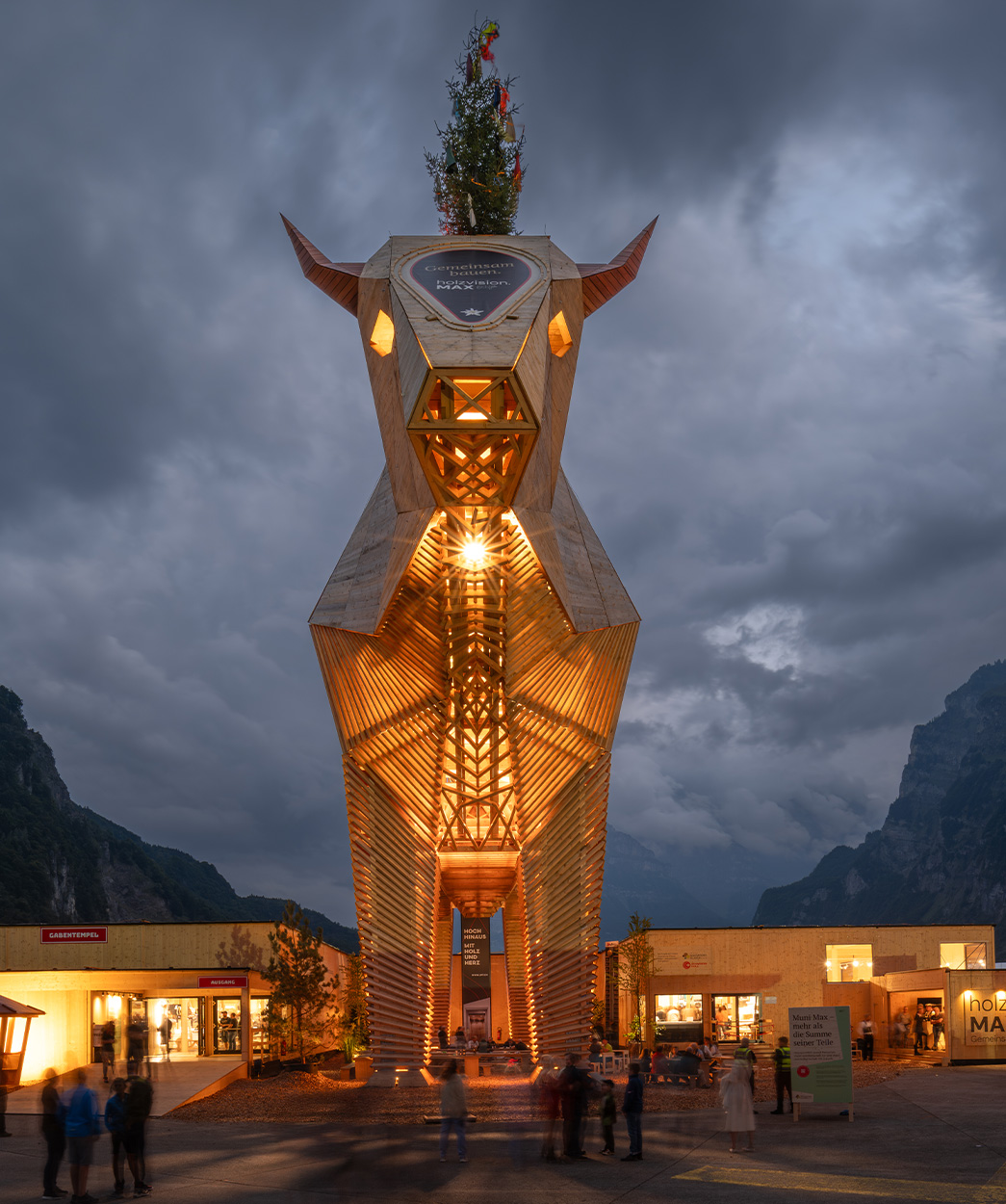 With HolzvisionMAX, an initiative emerged that showcases the Swiss forest and timber industry in all its facets. At its heart stands Muni Max – a 21-metre-tall, 180-ton structure made from 100% Swiss wood, serving both as a symbol for the entire industry and as a learning space for the next generation.